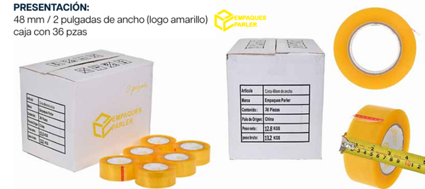 Caja de Cinta de empaque Uso Industrial con ultra pegado de 48mm (2 pulgadas) por 135 metros de largo, adhesivo acrilico con ultra anclaje. 36 pzas por caja